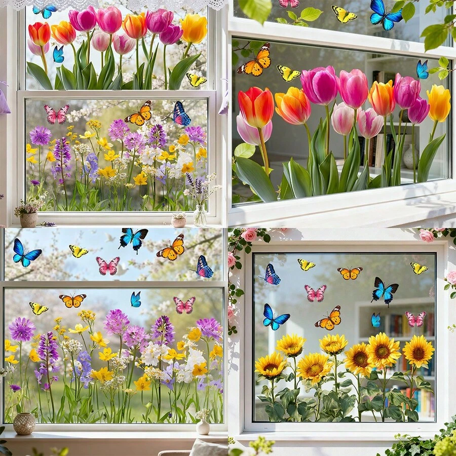 1/3pcs Spring Tulip Sunflower Wild Flower Stickers, Colorful Butterfly Static Cling Window Film, Suitable For Home Living Room Glass Door Decor, Anti-Collision Window Sticker, Reusable, Waterproof, Seasonal Holiday Decor PVC Film