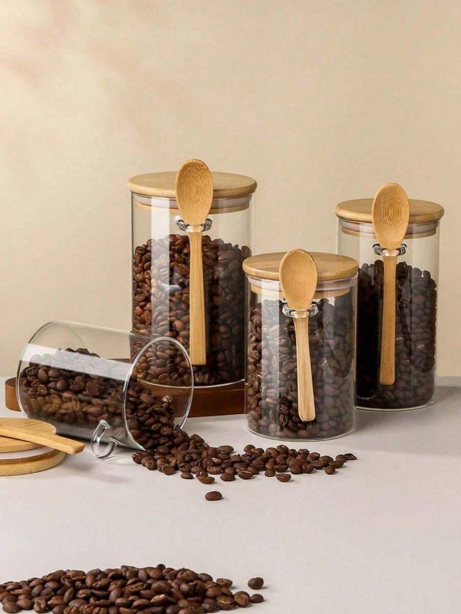 1pc Clear Food Storage Jar With Airtight Bamboo Lid & Spoon, Minimalist Coffee Canister For Beans, Tea, Sugar, Modern Kitchen Countertop Decor & Pantry Organization