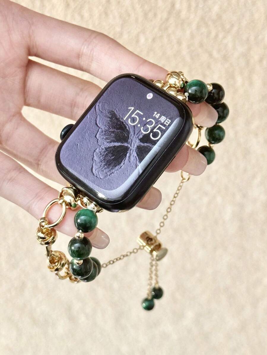1pc Women's Dark Green Tiger Eye Beaded Bracelet Metal Band Compatible With 38/40/41/44/45/49/42/46mm Series 11/SE3/Ultra3/Ultra/SE/SE2/10/9/8/7/6/5/4/3/2/1