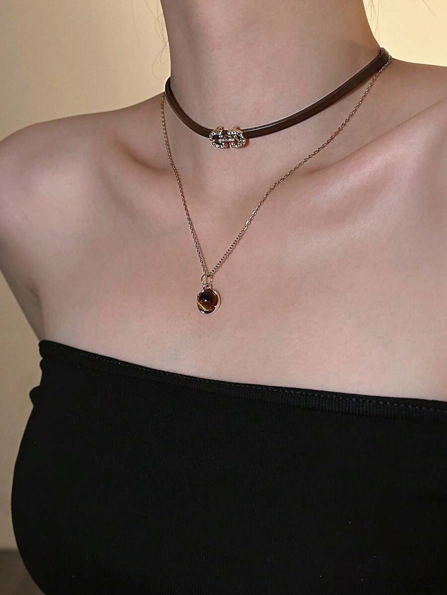 • 2pcs/Set Elegant Artificial Tigereye Multi-Layer Necklace, Gold Rhinestone Decorated Double Layer Chain Necklace, Charm Necklace For Women Shopping, Party, Ball, Date
