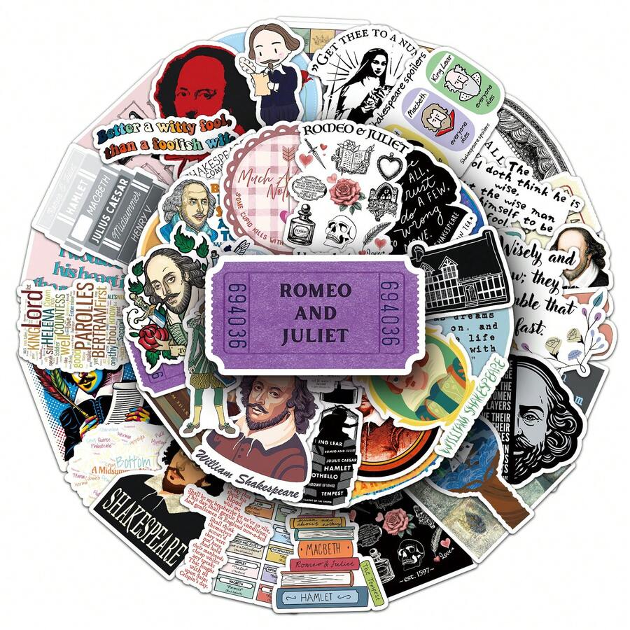 50Pcs William Stickes Reading Stickers Art Stickers Aesthetic Stickers Romeo And Juliet Books Stickers Vinyl Waterproof Stickers For Water Bottle,Computer,Laptop,Phone,Luggage,Notebook,Fridge,Bumper,Car,Guitar