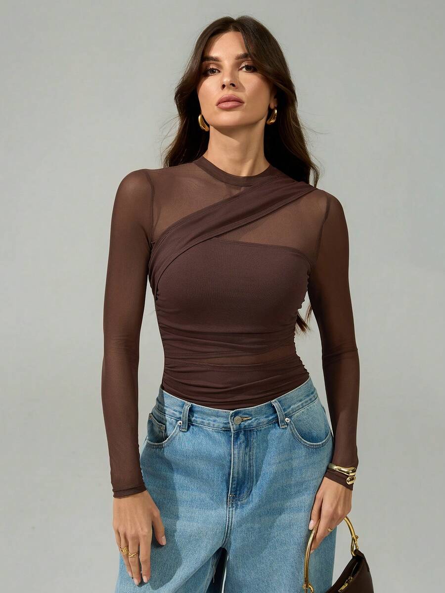 SHEIN Tall Brown Bodysuit For Women Sheer Mesh Long Sleeve Ruched Mock Neck Top, Suitable For Cocktail Party, Romantic Date, Winter Base Layer