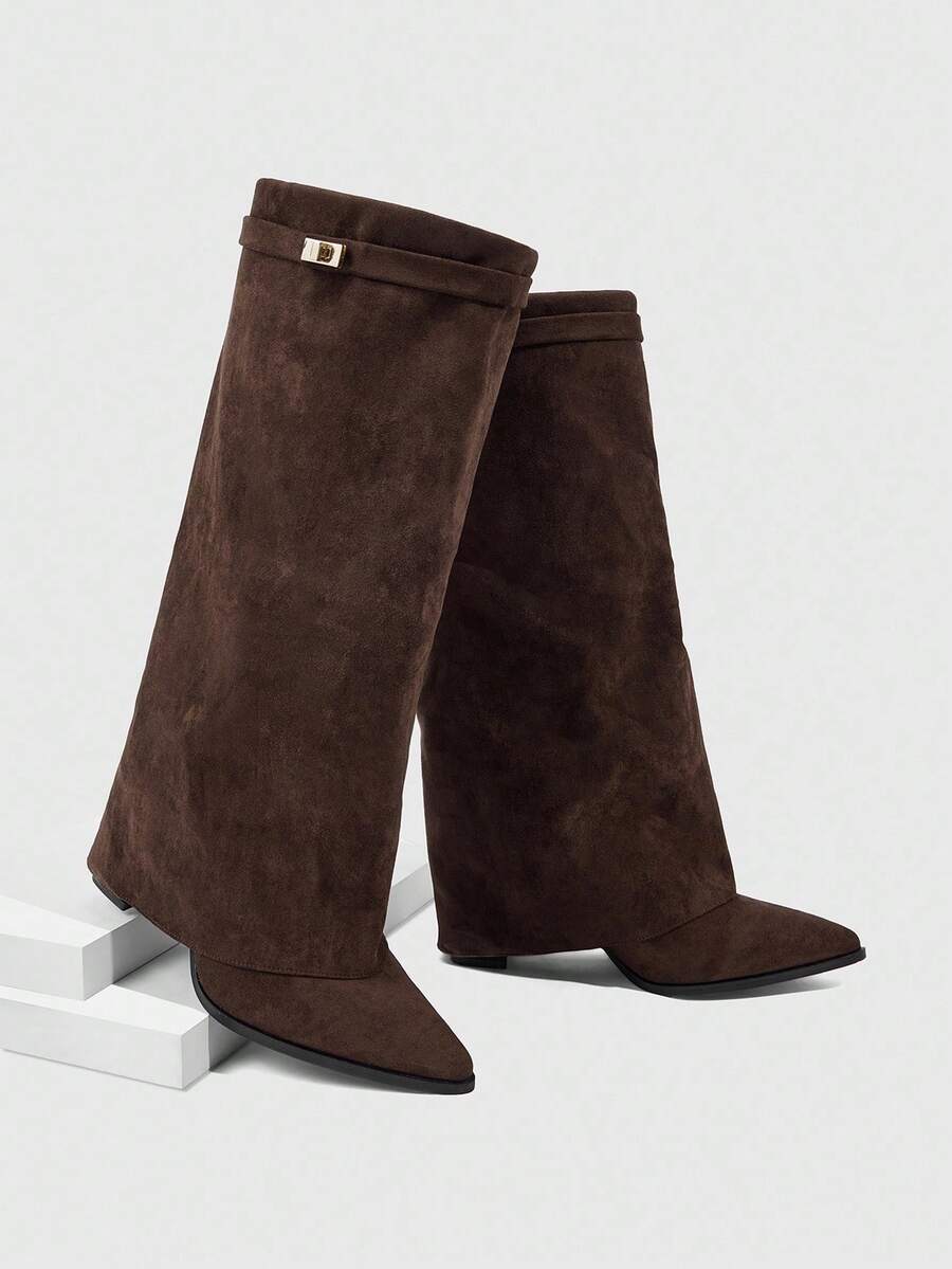 CUCCOO SZL Women's Pointed Toe Chunky Heel Suede Western Boots With Fringe, Slim Fit Tall Boots