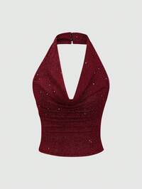 GlamineSHEIN Glamour 2 Piece Sets Red Brown Color Halter Neck Sexy V Neck Backless Sleeveless Asymmetrical Mini Skirtt Set, Autumn And Winter Clothing, Holiday Party Carnival Sets, Streetwear, Women Club Sets, Date Night Sets, Women Birthday Sets, Elevated Elegance, Party Must Have, Halloween Sets, Christmas Sets, Vintage Style, Urban Comfort, Street Style, Satin Graduation Dress, Retro Fashion, Backless Top Sets #1 Bestseller