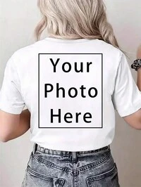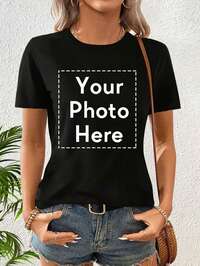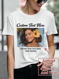 Customized Photo Print Women's T-Shirt, Personalized Name Text Print, Suitable For Valentine's Day, New Year, Birthday, Anniversary, Holiday, Upload Your Selfie/Friend/Couple/Pet Photo And Customize Text, White Short Sleeve Round Neck, Birthday Gift, Music Festival Clothing, Personalized Apparel, Summer Top,Ornamental,Dawg,Unique,Custom,Belle Costume,Ideal Gifts For Her,Family,Friends,Pink Girls,For Holiday,For Vacation,For Anniversaries,Customized Women Tops,Street Casual Chic
