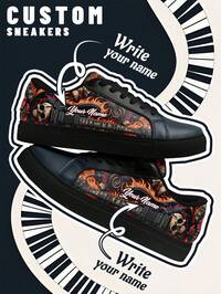 [Rock Music Festival Theme] Women's Custom Name Low-Top Sneakers, PU Upper Panel Shoes, Skull And Guitar Flame Print, Lightweight Unisex All-Season Casual Wear