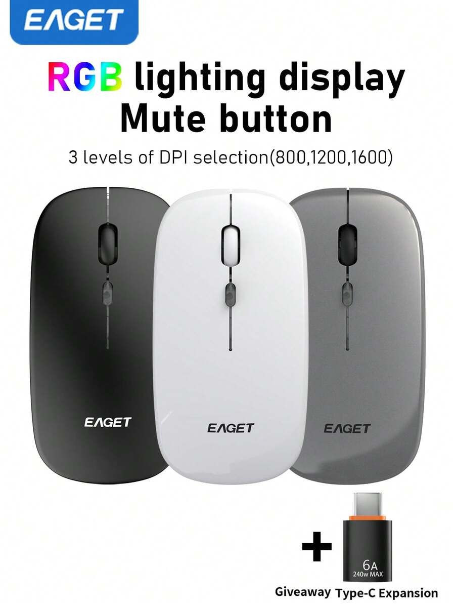 EAGET 7 Colors RGB Backlight Silent Wireless Mouse 2.4G LED Light Portable Mouse Compatible With Laptop And Tablet Dual Mode Free Adapter