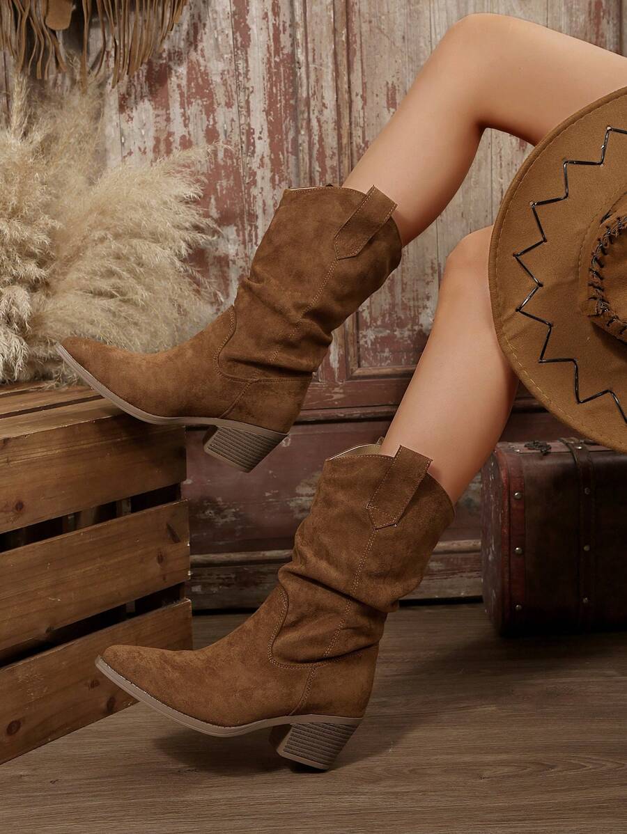 Fall/Winter 2025 Women's Pointed Toe Chunky Heel Western Cowboy Mid-Calf Boots