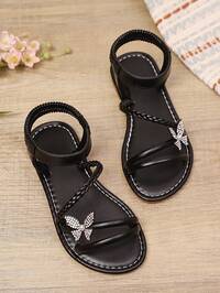 1 Pair Black Plus Size Toddler Girls' Fashion Sandals, Solid Color PU Woven Strap, Shiny Colorful Butterfly Decor, Elastic Ankle Strap, Round Toe Open Toe, Flat Non-Slip Comfortable Elegant Cute Roman Sandals, Suitable For 3-15 Years Old Girls, Daily, Casual, Party, Travel, Spring/Summer 2026