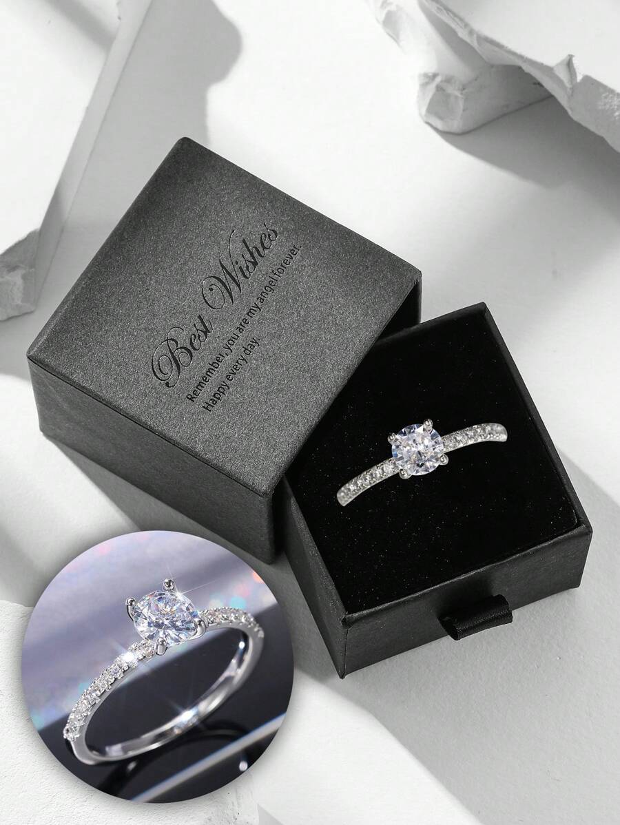 Gift Box Set - Minimalist & Elegant Cubic Zirconia Ring, Copper White Gold Plated, Suitable For Women Engagement, Wedding, Holiday Gift