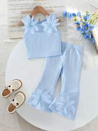 2pcs/Set Toddler Girls' Solid Color Textured Sleeveless Top And Flare Pants Set, Fashionable Casual Outfit With 3D Floral Decor, Cute For Young GirlSummer