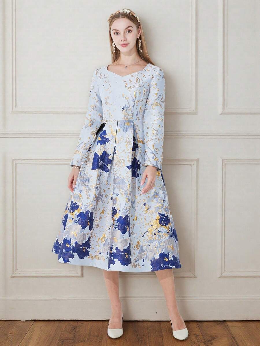 Luxurious Jacquard Elegant Long Sleeve Party Dress, Autumn/Winter