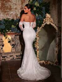 GlamraeGlamrae Elegant And Glamorous, White, Sequined Embroidery, Luxurious Satin, Sailboat Neckline, Long Sleeves, Faux Two-Piece Design, Mermaid Skirt, Train. Suitable For Weddings, Bridal Gowns, Heavily Embellished Wedding Dresses.,Wedding Party Dress