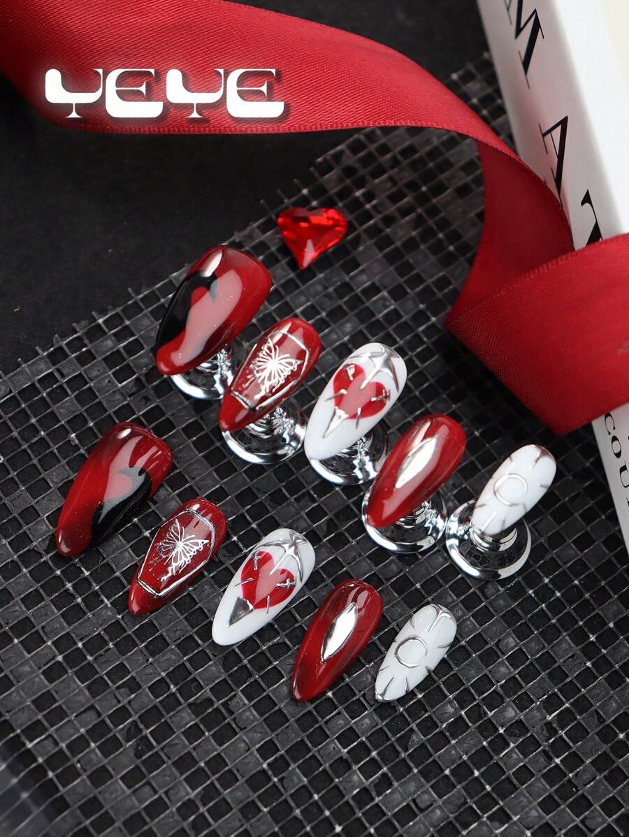 Transform Your Nails With 10pcs Almond Shape Japanese Style Red White Valentine's Day Heart Creative Full Coverage Fake Nail Set European Style Butterfly Sweet Love Funny Full Cover Acrylic False Nail Kit For Women And Girls Nordic With 1pc Mini Nail File & 1 Sheet Adhesive Tabs