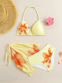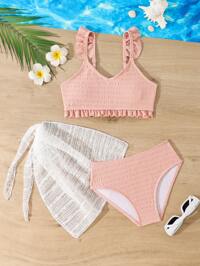 Play ParadeSHEIN Tween Girls Bikini Sets Fashionable Blue + Mesh Knitted Fabric Strapless Top, Shoulder Strap + Mesh Skirt, Three-Piece Set, Separate Strapless Shoulder Strap Metal + Triangle Pants + Mesh Skirt, Fashionable, Casual, Exquisite, Elegant And Ladylike, Suitable For Swimming, Suitable For Summer Vacation, Summer Beach, Seaside Pool, Swimming Pool, Summer Party, Leisure Vacation #3 Bestseller