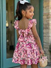 SHEIN SLAYR KIDSTween Girls Ditsy Floral Waist Cinched V-Neck Dress, Suitable For Beach, Vacation, Hawaii Trip, Family Matching, Sister Photo Shoot, Park, Camping, Party, Casual Daily, Leisure Holiday