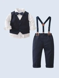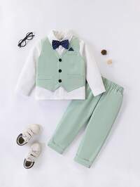 SouflisSouflis Souflis 3pcs Young Boy Gentleman Outfit Set, Includes Bow Tie, White Collared Shirt, Vest And Casual Shorts, Fashionable Gentleman Suit For Daily Casual Wear, Birthday Party, Wedding, Halloween, Christmas, Thanksgiving Celebration, Formal Attire, Performance, Spring/Summer Back To School Season Fall Winter